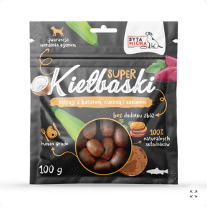 Super kiełbaski dla psa z pstrągiem, batatem, cukinią i kokosem 100g