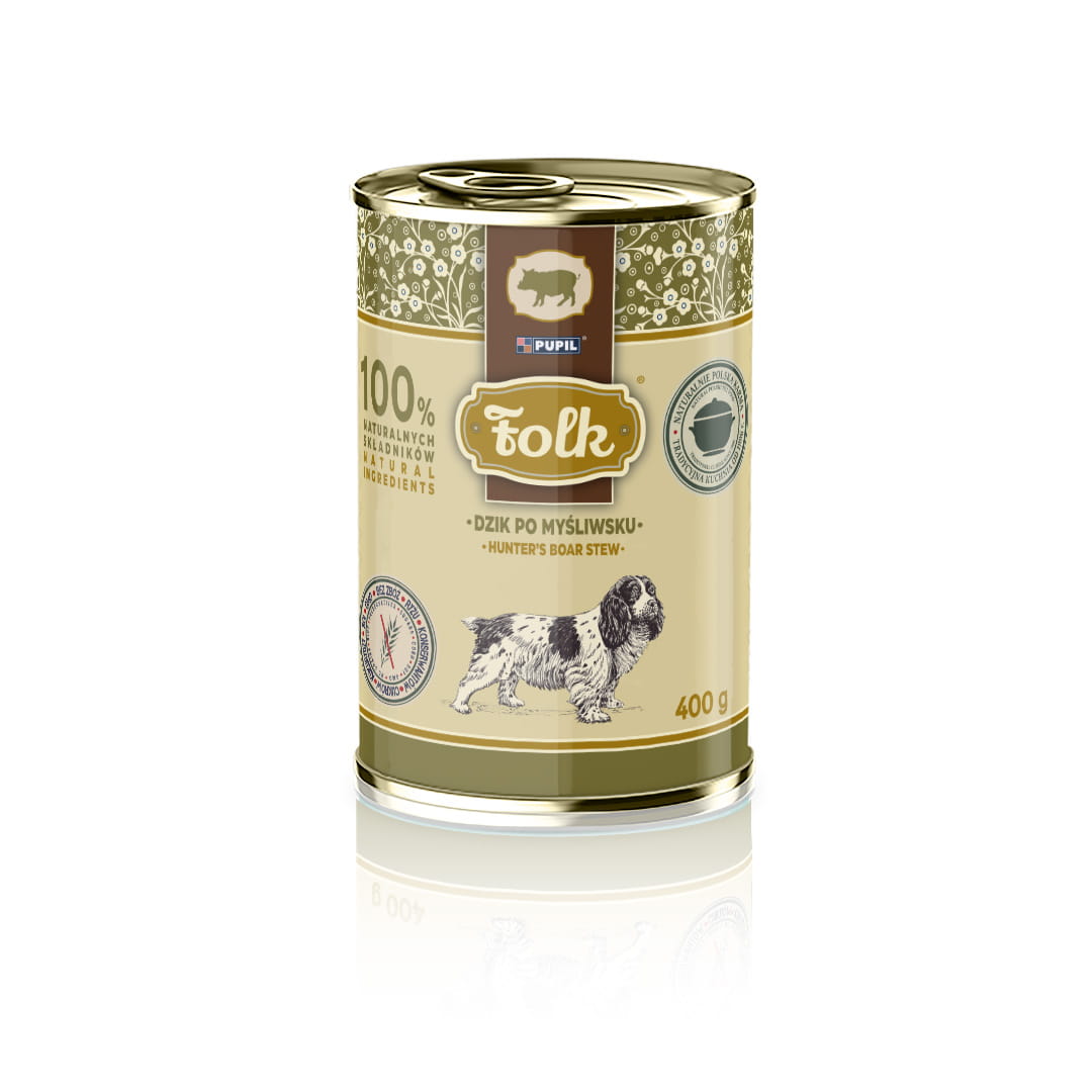 Najważniejsze cechy mokrej karmy FOLK Dzik po myśliwsku 400 g: