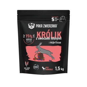 - 75% zawartości królika, owoców leśnych, oleju z łososia, ziemniaków oraz ziół