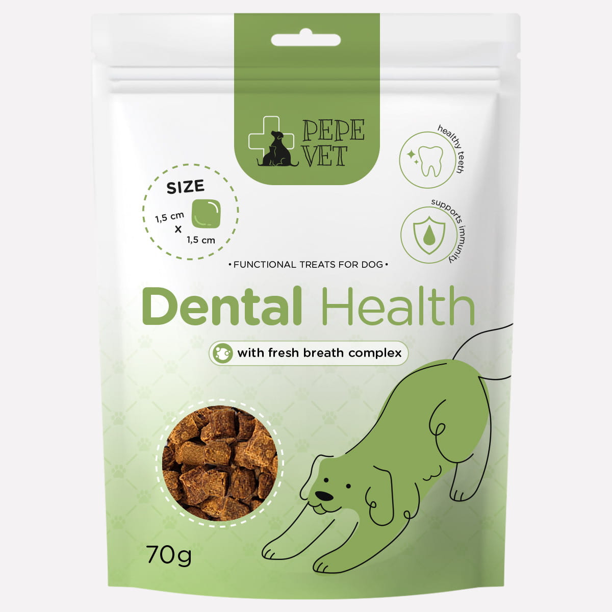 PEPE VET Dental Health to funkcjonalne przysmaki stworzone z myślą o codziennym wsparciu zdrowia jamy ustnej psa. Każdy kawałek łączy wysoką zawartość mięsa z indyka z naturalnymi składnikami wspierającymi higienę zębów, świeży oddech oraz ogólną kondycję pupila.