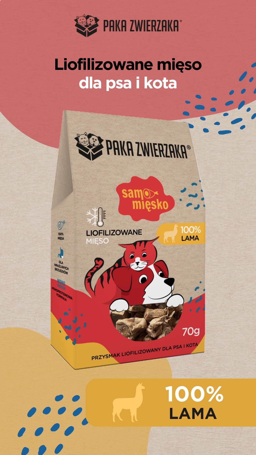 SAMO MIĘSKO - przysmak z lamy to wyjątkowy, jednoskładnikowy przysmak stworzony z myślą o najbardziej wymagających czworonogach. W 100% złożony z mięsa lamy, bez dodatku zbóż, konserwantów czy sztucznych aromatów. Liofilizowane, czyli delikatnie suszone w niskiej temperaturze, aby zachować to, co w mięsie najcenniejsze – naturalny smak, aromat i składniki odżywcze.